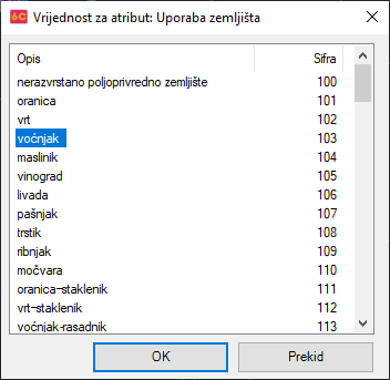 2. korak - odabir vrste uporabe. Pritisak na zaglavlje stupca (Opis, Šifra) sortira popis. |