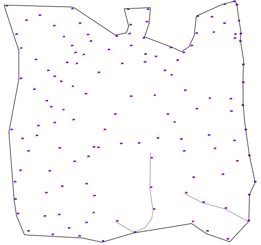 Slika prikazuje grupu 2.5D točaka (SDGE block) sa nekoliko linija prijeloma te granicom obuhvata: