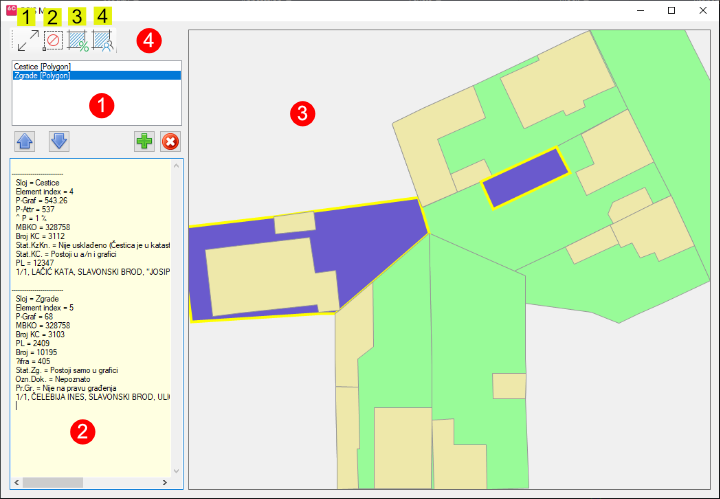 (3) - prikaz slojeva prema redoslijedu iz polja (1). Klikom na element, koji mora biti u aktivnom sloju (1), ispisuju se vezani GIS atributi u polje (2) te se isti označava plavom bojom.