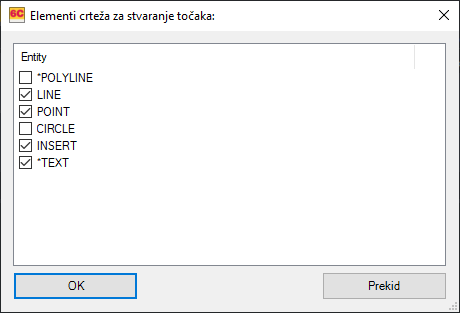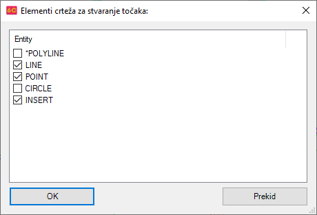 Određuje iz kojih CAD elemenata crteža je omogućeno stvaranje točaka. Inicijalno su odobreni svi navedeni elementi: