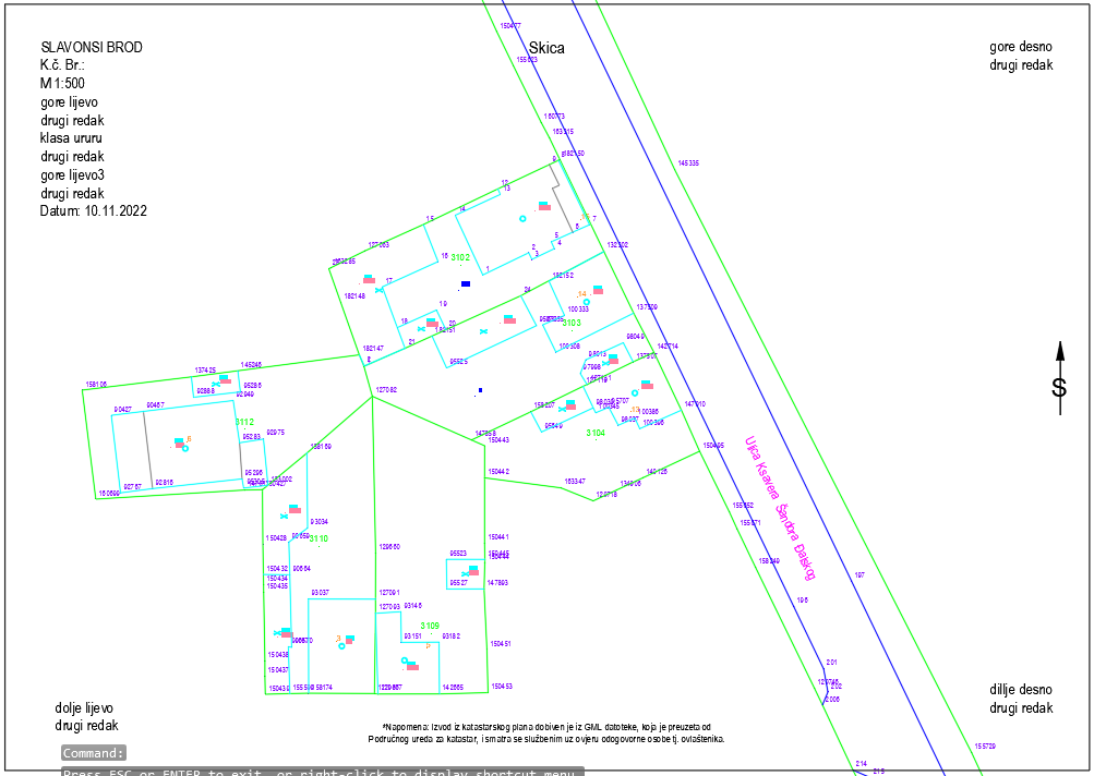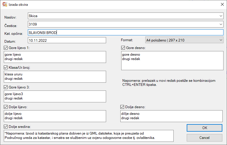 Odjeljak DGE Grafika Okviri i opisi u Modelu Kao alternativa izradi okvira u Layout-ima, postoji način za izradu i ispunjavanje ovira u Modelu: U prvom koraku se ispunjavaju podaci okvira - kvačicama i tekstovima se postiže fleksibilnost prikaza željenih podataka: Ovako izgleda unešen okvir:
