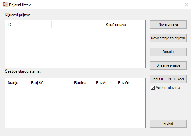 Za analognu izradu prijavnog lista i iskaza površina napravljen se skup naredbi, koje čine cjelinu.