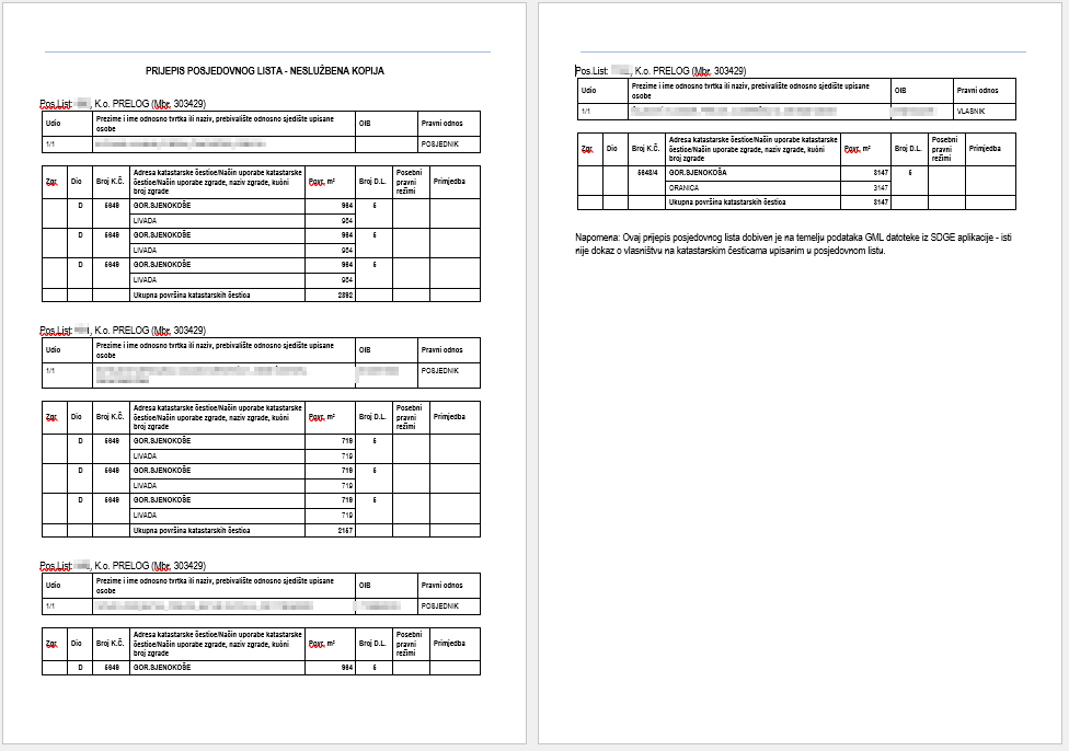Nakon odabira, potrebno je još jednom potvrditi postupak, nakon čega G6CAD pronalazi katastarske podatke o istima te ispisuje posjednike, pravni odnos te detaljne podatke o načinu korištenja dijelova čestica te atributne površine.