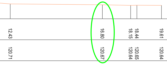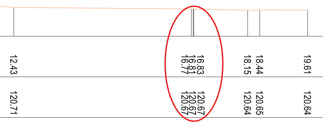 Pri stvaranju profila iz DMR-a, računaju se se svi pregibi profila i presjeci svih rubova trokuta reljefa. U određenim situacijama doći će do vrlo bliskih presjeka trokuta reljefa te time grupiranja podataka o visini i udaljenosti. Sljedeća slika prikazuje takav slučaj, odnosno tri vrlo bliska presjeka: