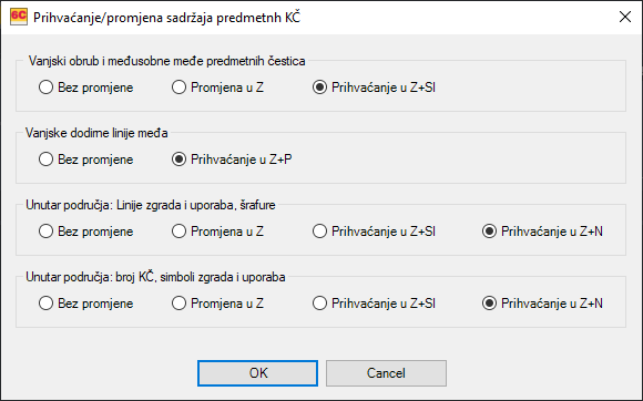 Nakon odabira predmetnih čestica, u za to predviđenom formularu potrebno je odraditi vrste promjena po grupama sadržaja koji se dijeli u četiri grupe: