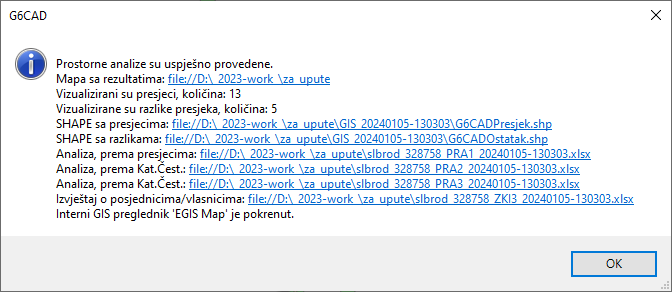 Postupak prostornih analiza stvara uvijek tri Excel datoteke kao rezultat analize, te četvrtu ako je odabrana opcija "Izvještaj identifikacija posjednika i vlasnika". Sve datoteke imaju isti format naziva:
