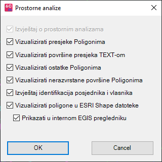 Svrha prostornih analiza je računanje presjeka konstruiranih ili mjerenih CAD elemenata crteža sa poligonima katastarskih čestica iz inicijalnog (OSS.GML).ZIP DKP-a. Jedan ili više CAD elemenata presjeka se direktno odabiru u crtežu - podržani CAD elementi su Block, Točka, Kružnica, LwPolilinija (zatvorena i otvorena) i Linija.