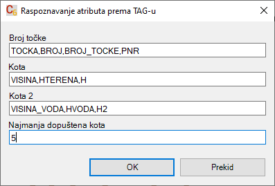 G6CAD raspoznaje vrijednosti atributnom oznakom TAG. U svrhu ispravnog raspoznavanja vrijednosti atributa u softveru, potrebno je u za to predviđena polja unijeti TAG atributa koji predstavlja jednu od vrijednosti: