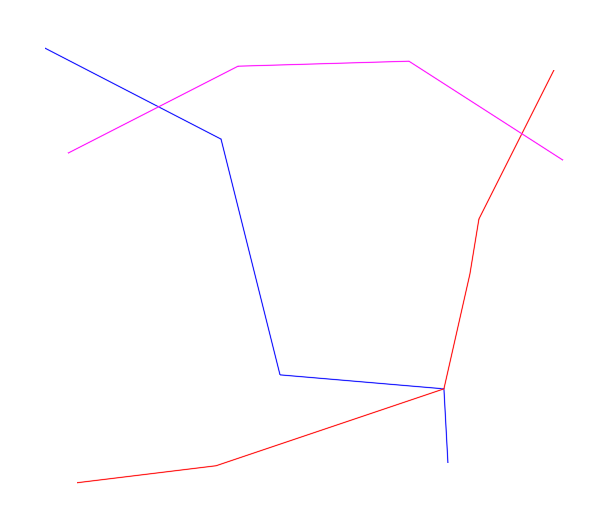 Rezultat - segmenti su spojeni u cjeline od račvanja do račvanja (svaka novo stvorena polilinija je prikazana zasebnom bojim u svrhu lakšeg razumijevanja).