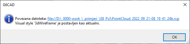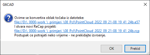 Ukoliko je odabrana datoteka formata E57, LAS ili LAZ, provodi se konverzija u Autodesk RCP format: