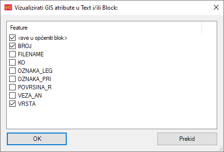 - Vrijednosti GIS atributa sukladno aktivnim oznakama biti će prikazani u TEXT elemente u sloju _G6GISFeatures, čiju visinu je potrebno odrediti u sljedećem koraku: