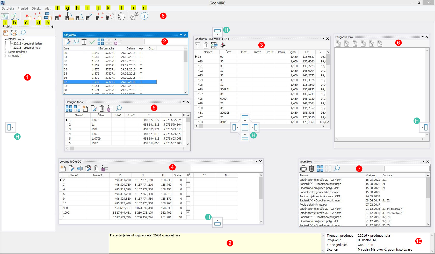 |a| - Uvoz podataka mjerenja |b| - Uvoz točaka/koordinata |c| - Obrada točaka GO |d| - Obrada detaljnih točaka |e| - Stajališta |f| - Računanje vlakova |g| - Računanje slobodnog stajališta |h| - Računanje trigonometrijskog visinskog priključka |i| - Računanje polarnih točaka |j| - Računanje detaljnih točaka |k| - Izjednačenje mreže |l| - Stvaranje objekata iz kodova |m| - Svojstva predmeta |n| - Informacije |