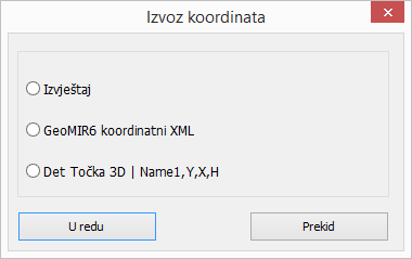 Izvoz koordinata točaka radi po istom principu za točke GO kao i za detaljne točke. Prvo je potrebno odabrati točke iz tablice, te potom odabrati "Izvoz" iz kontekst izbornika ili tipkom za brzi pristup. Slijedi sljedeći formular: