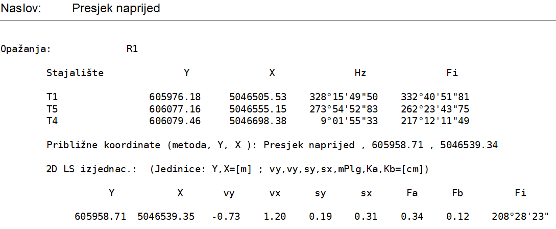 U završnom koraku slijedi računanje koordinata točaka metodom presjeka naprijed te izrada izvještaja. Ukoliko ima više od dva opažanja, provodi se strogo izjednačenje Gauss-ovom metodom najmanjih kvadrata u tri iteracije.
