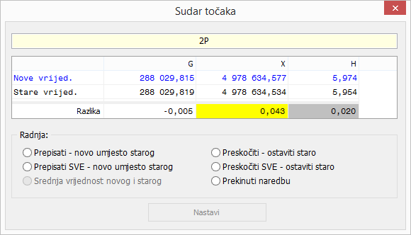Formular koji se pojavljuje prilikom sudara prikazuje u prvom broj točke, te ispod stare i nove vrijednosti koordinata, te razlike po osima novo - staro.